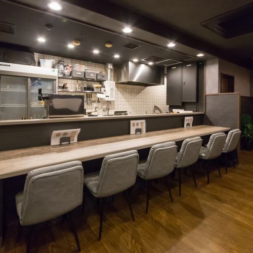 お一人様やデートでも気軽に利用できるカウンターを6席ご用意。調理の活気を間近に感じられる特等席は、スタッフとの会話や、目の前で仕上げられる料理を待つ時間も楽しみのひとつです。シックで落ち着いた雰囲気の中、厳選された美酒を片手に、自分へのご褒美や大切な方との語らいをゆったりとお楽しみください。